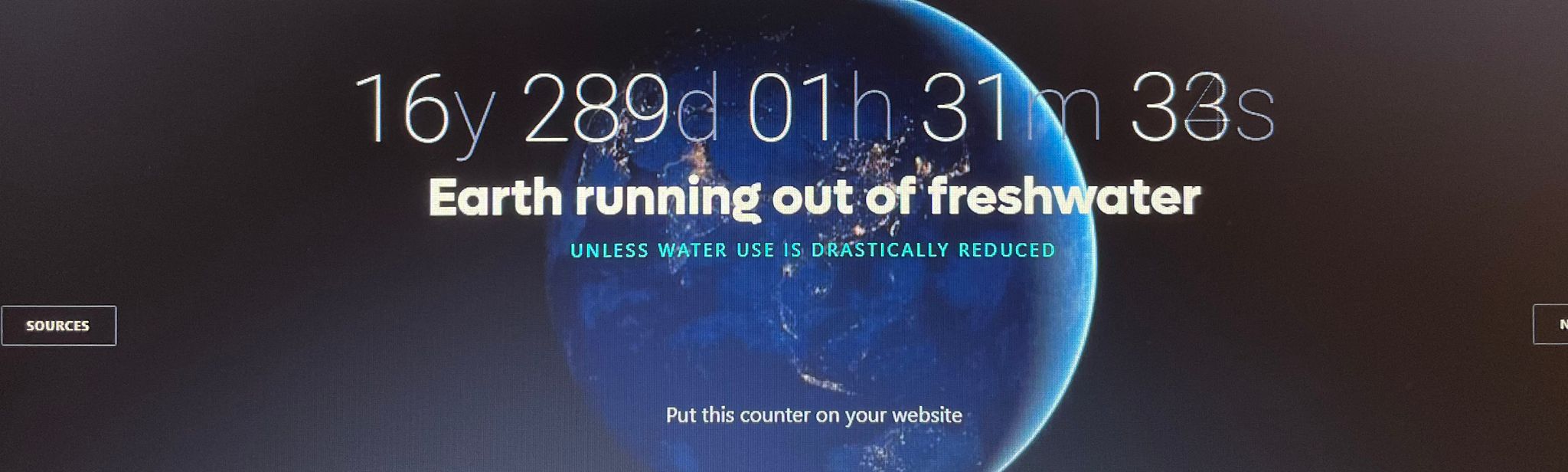 “The World Counts” isimli çevreci internet sitesinde bir sayaç bulunmaktadır. Bu sayaç, dünyadaki tatlı suyun bitmesine ne kadar süre kaldığını gösteriyor. 17 yıl civarında bir süremiz mevcut ve eğer su kullanımı mucizevi bir biçimde azaltmazsak bu sayaç daha da hızlanacak. Sitenin verilerine göre 2040 yılında dünya nüfusunun 2/3’si susuz kalacak ve 2050 yılına kadar su talebi neredeyse %400 artacak.