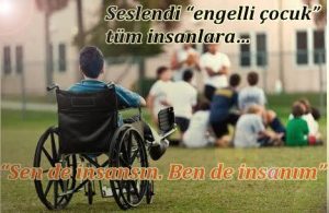Sokaktaki hiçbir imkan onlar için uygun değil. Birazda biz mi yaşam haklarını ellerinden alıyoruz? Bizim için dışarıda yürümek çok basit olabilir, üst geçitler yine bizim için peki onlar? Biraz daha duyarlı olursak belki onlar için bir şeyler yapabiliriz. Televizyon izlerken görmüştüm; “ENGELSİZSİNİZ”. Gerçekten engel biz miyiz? Biz nasıl rahat gezip dolaşıyorsak onların da buna hakkı var. Ben arkadaşlarıma sesleniyorum onları dışlamayalım, onlarla oyun oynayıp onları anlayalım, uzaktan seyrederlerse sadece üzülürler. Ben daha önceleri pek anlayamazdım onları ama annem sürekli benimle konuşur onları dışlamanın onları üzeceğini .söylerdi. Onlara yardımcı olmamız gerektiğini sevgimizi onlara göstermemiz gerektiğini artık daha iyi anlıyorum. Onları belki herkes böyle düşünürse engeller yok olur. Engellilerin daha rahat yaşamaları için parkların, yolların, okulların onlara göre düzenlenmesi gerekir. El ele verirsek engelleri ortadan kaldırabiliriz. Onların fiziksel, zihinsel, işitme ve görme engelleri olabilir. Ama bu onların Hiçbir şey yapamayacakları anlamına gelmez, yeter ki onları görmemezlikten gelmeyelim. Bu tamamen onları umutsuzluğa iter. Haydi arkadaşlar uzatalım onlara elimizi ve bu engeli hep beraber kaldıralım. Yarın belki her şey çok farklı olabilir.