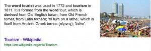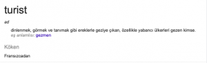 İngilizcesine baktığımız zaman “Tourist” sonucunu alıyoruz. İngilizcede “Tour” tur anlamına geliyor ve “-ist” eki de bir mesleği yapan kişilerin yaptığı işin sonuna ekleyerek kullandığımız bir ek. Fakat biraz araştırma yapınca olayın böyle oladığı kanısına vardım. Tour kelimesi meğer Fransızcadan geliyormuş.