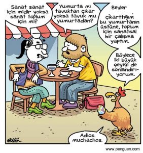 Şimdi de sanat, sanat içindir görüşünü örneklemeye çalışalım. Eğer sanat sanat içinse her sanatçının bir diğerinin bıraktığı yerden devam ederek sanatı geliştirmesi lazım. Nasıl yani şimdi de sanatın ilerlemesine katkıda bulunmayan kişi sanatçı sıfatına erişemiyor mu ?