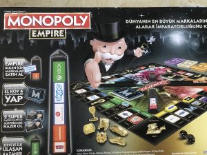 Monopoly Empire bir kutu oyunudur.Monopoly Empire oyunu en fazla 4 ve en az 2 kişi 👬ile oynanır.Oyunda öncelikle markaları yerine koyuyoruz. Sonra kendimize ve arkadaşlarımıza 4 tane 100 TL 💵💴,3 tane 50 TL , 1 tane 500 TL değerindeki oyun banknotlarını veririz. Sonra şans kartı ve ona benzeyen karttan 2 tane alıyoruz.İçinde pek çok şey yazıyor.Mesela “reddet” yazarsa markayı marka kulesine koymasına izin vermeyip kartı yerine koyuyoruz.Oyuna zar atarak başlıyoruz. Bu zarları 🎲atıp ikisini sayarak seçtiğimiz oyuncakları ilerletip bir markaya gidiyoruz.İstersek markayı alıp marka kulesine koyuyoruz.Marka kulesinde sayılar yazıyor.1 tur yaptıktan sonra sayıda ne yazıyorsa o kadar para alıyoruz.Marka kulesini taşan oyunu kazanıyor.Boş zamanlarımızda ailemle birlikte oynuyoruz.Bu oyunda en fazla ben kazandım.Babamın markalarını alırken çok gülüyorum😄😄Benim en sevdiğim marka ketçabın markası .Çünkü ketçabın markası çok uzun olduğu için marka kulesini çok fazla kaplıyor. Oyunu ilk bitirmeme yardımcı oluyor🥇🏆