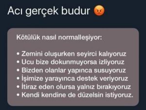 Ayrıca bu normalleşmenin bir etkisi olarak insanların “o bunu yapmış ben neden yapmayayım?” dediğini düşünüyorum. İnsanlar zaten bu cümleyi kurmaktaydılar. Fakat bu normalleşme sürecinde insanlar çok yanlış şeyleri görüyor ve zor bir durumda kaldıklarında bu cümleyle vicdanlarını rahatlatarak o işi doğru ve olması gerektiği gibi değil, kötü ve uygun olmayan yoldan çözmeye çalışıyorlar. Çünkü o işi doğru yapmanın zor olduğunu düşünüyorlar. Ben bu yüzden hırsızlıkların veya gördüğümüz öteki suçların arttığını düşünüyorum. Çünkü bir tek bu tarz programlar da değil. Gördüğümüz hemen her program bu normalleşmeyi ister istemez sağlıyor.