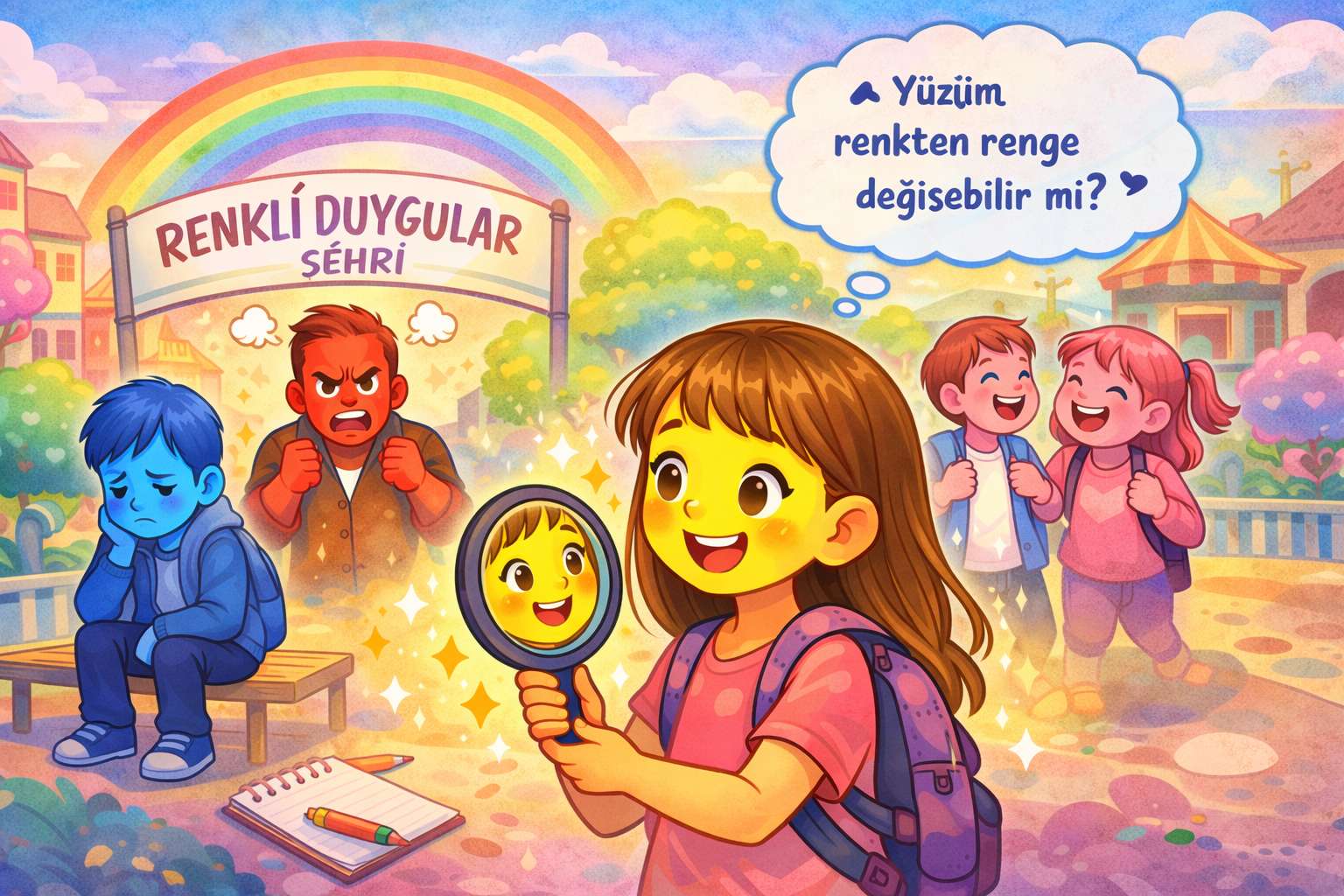 Bu şehrin adı ”Renk”. Bu şehirde duygular renklere göre belirlenir. Mutlu= Sarı , Heyecanlı= Turuncu , Üzgün= Mavi , Kızgın= Kırmızı , Endişeli= Lacivert , Korkmuş= Yeşil. Örneğin o gün üzgünsen ”üzgünüm” yerine ”maviyim” diyebilirsin. Ya da bir eşyanın üzerinde bir renk belirir. İnsanlar böyle anlarlar. Bu Ali , her zaman mutludur. İnsanlar ona ”nasılsın?” diye sorarlarsa cevabı hep ” sarıyım” olurdu. Bu Buse , çok hareketli ve heyecanlıdır. Etrafta sürekli ” Turuncu , turuncu , turuncu!” diye gezinir. Bu Ceylin , çok süslü biridir ama hiç bir zaman mutlu olamaz. Tüm takıları maviye dönerdi. ”Maviyim” adlı bir şarkısı vardır. Kliplerinde hep mavi giyinir. Bu Çınar , her zaman kızgındır. En ufak bir şeye bile kızar. Her şeyinin kırmızıya dönmesini bir kenara bırakırsak , yüzü bile kızarır. Bu Deniz , her zaman endişelidir. Her zaman laciverttir. Bu Esin , çok korkak biridir. Her yerde ”Çok yeşil oldum!” diye bağırır. Yani bu şehir renklerden ibarettir.