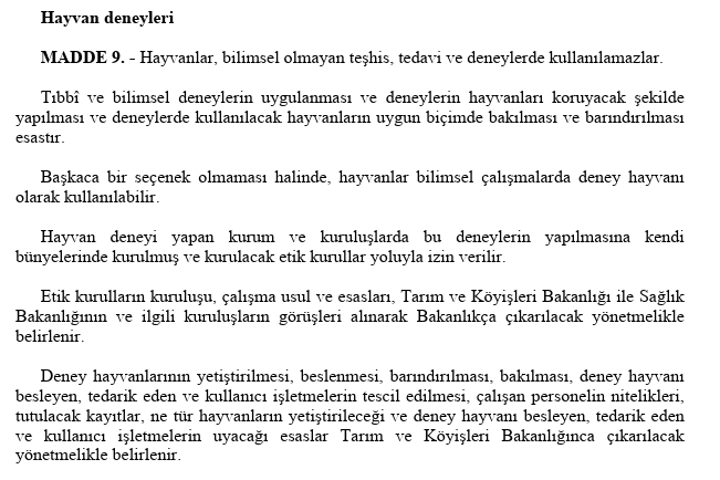 İşin insani boyutunu bir kenara bırakıp olayı başka bir pencereden yorumlayacak olursak bu, her vatandaşın uyması gereken anayasanın bu konu ile alakalı maddeleri olacaktır. Türkiye Cumhuriyeti Anayasası’nın 5199 sayılı ‘Hayvanları Koruma Kanunu’nun 4. maddesinin (a) bendine göre bütün hayvanlar eşit doğar ve bu kanun hühümleri çerçevesinde yaşama hakkına sahiptir, (c) bendine göre ise hayvanların korunması, gözetilmesi, bakımı ve kötü muamelelerden uzak tutulması için gerekli önlemler alınmalıdır. Türkiye Cumhuriyeti Anayasası’nın 5199. sayılı ‘Hayvanları Koruma Kanunu’nun 9. maddesine göre hayvanlar, bilimsel olmayan teşhis, tedavi ve deneylerde kullanılamazlar fakat başkaca bir seçenek olmaması halinde bilimsel çalışmalarda deney hayvanı olarak kullanılabilirler. Bu maddede hayvan testinden detaylı bir şekilde bahsedilmiştir.