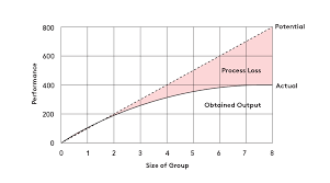 Firstly, let’s talk about the recent data and scientist that came up with the theory that as the amount of people in a group that is working on the same goal increases the work done by singular person decreases. This theory was put forth by French agricultural engineer Max Ringelmann. He conducted several experiments on this topic the most famous one being the “tug of war” experiment. The way he directed this experiment was by observing 2 teams that were playing tug of war. First, he arranged a 2 player game of tug of war(there being 1 player on each side) his observations were that each player was trying their best to win. “100 % effort” as he put it. Then he observed a 4 player game of tug of war there being 2 players on each side this is where his observations deviated from the traditional idea that more people equaled more output. While the 2 player teams did try to win each player was only using about 90% of their potential. This trend of individual contribution to the team decreasing as the team grew in size. The graph given below were his findings.