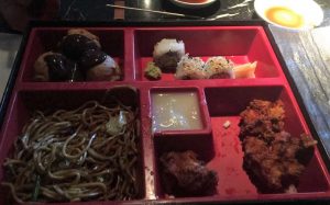Mekana gittiğimde ilk başta endişelenmiştim nasıl çöp stick kullanılır diye ama daha sonra öğrendim ki çöp stickleri tepesinden bağlıyorlarmış. Böylece kullanmak çok daha kolaylaşıyor. Mekanın menüsüne gelirsek daha çok tavuk ve sushi ağırlıklı ama sushiler Japon eğil Amerikan. Hayatımda ilk defa sushi yiyeceğim için heyecanlıydım ama beklediğim kadar kötü değildi hatta iyi bile denebilir. Her pazartesi saat 5 e kadar açık büfesi olan bu mekanın yemeklerini yemenizi tavsiye ediyorum. Akşam üstüne doğru kalabalıklaşan bu mekanda kalabalığa rağmen servis hızında herhangi bir aksama ve yavaşlama söz konusu bile değil. Mekan temizlik ve hijyen bakımından gerek servis malzemeleri gerek tuvaletleri olarak gayet hijyenik ve temiz gözüküyor. Bence sipariş olarak verilmesi en mantıklı şey bento yani bizdeki karşılığı tabldot. Her şeyden bulunan bu seçenek çeşitlilik, lezzet ve fiyat bakımından insanı mutlu edecek cinsten.